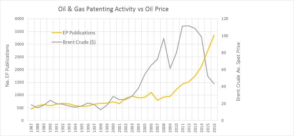 This culture of innovation within the oil and gas industry has not only developed despite low oil prices, but one could argue that the low oil price has actually contributed to the growth of patenting activity.