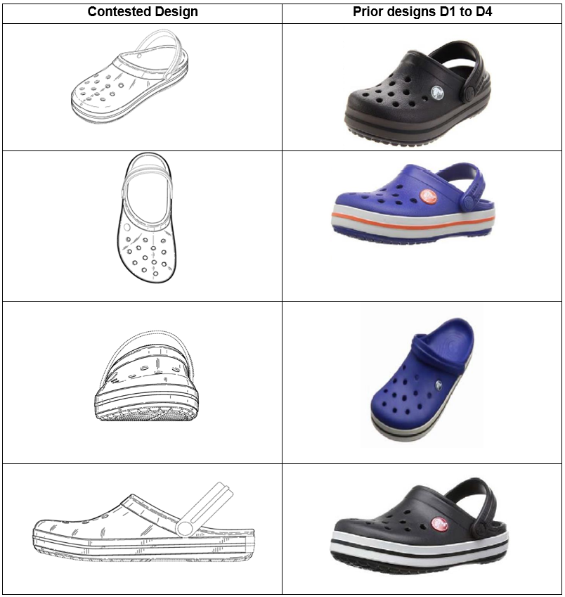 In this case Crocs succeeded in defending a registered design protecting one of their famous clog designs when challenged by HSM using prior designs including Amazon product listings.