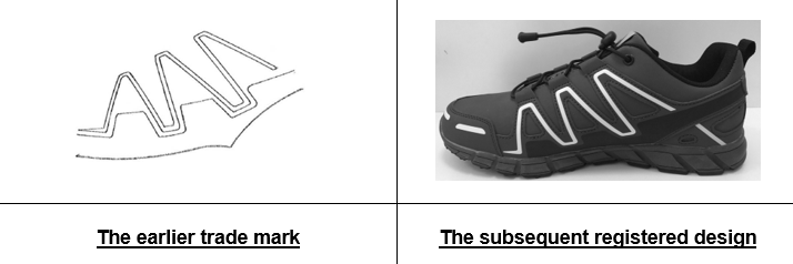 The proprietor of the registered design argued that a zigzag line is commonly used by footwear manufacturers and therefore possesses a very low degree of distinctiveness, so every small difference must be taken into account. The Invalidity Division did not agree, saying that the earlier trade mark is not a simple geometric formation or a simple design, and so it has an average degree of distinctive character.